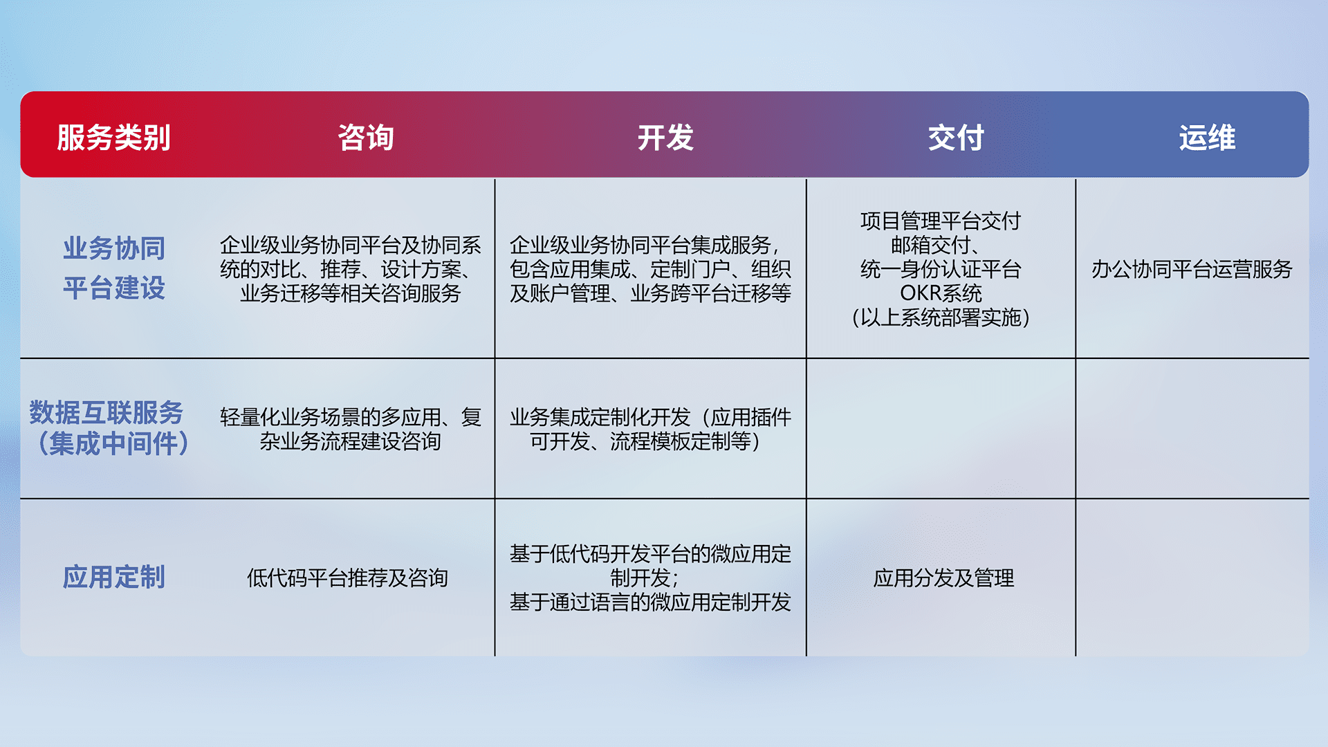 针对钉钉、、、、企微、、、IDaas等平台级产品提供产品的规划、、、方案、、、交付、、定制化开发等服务,,,,实现如统一协同办公、、、智能客户服务、、、、混合会议管理、、、智能数据查询、、等业务场景,,,,实现数字化转型。。。。
